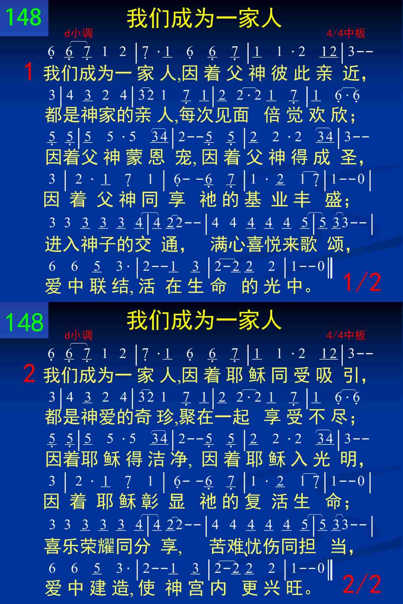 我们成为一家人,因着父神彼此亲近,都是神家的亲人,每次见面倍觉欢欣;因着父神蒙恩宠,因着父神得成圣,因着父神同享祂的基业丰盛;进入神子的交通,满心喜悦来歌颂,爱中联结,活在生命的光中。