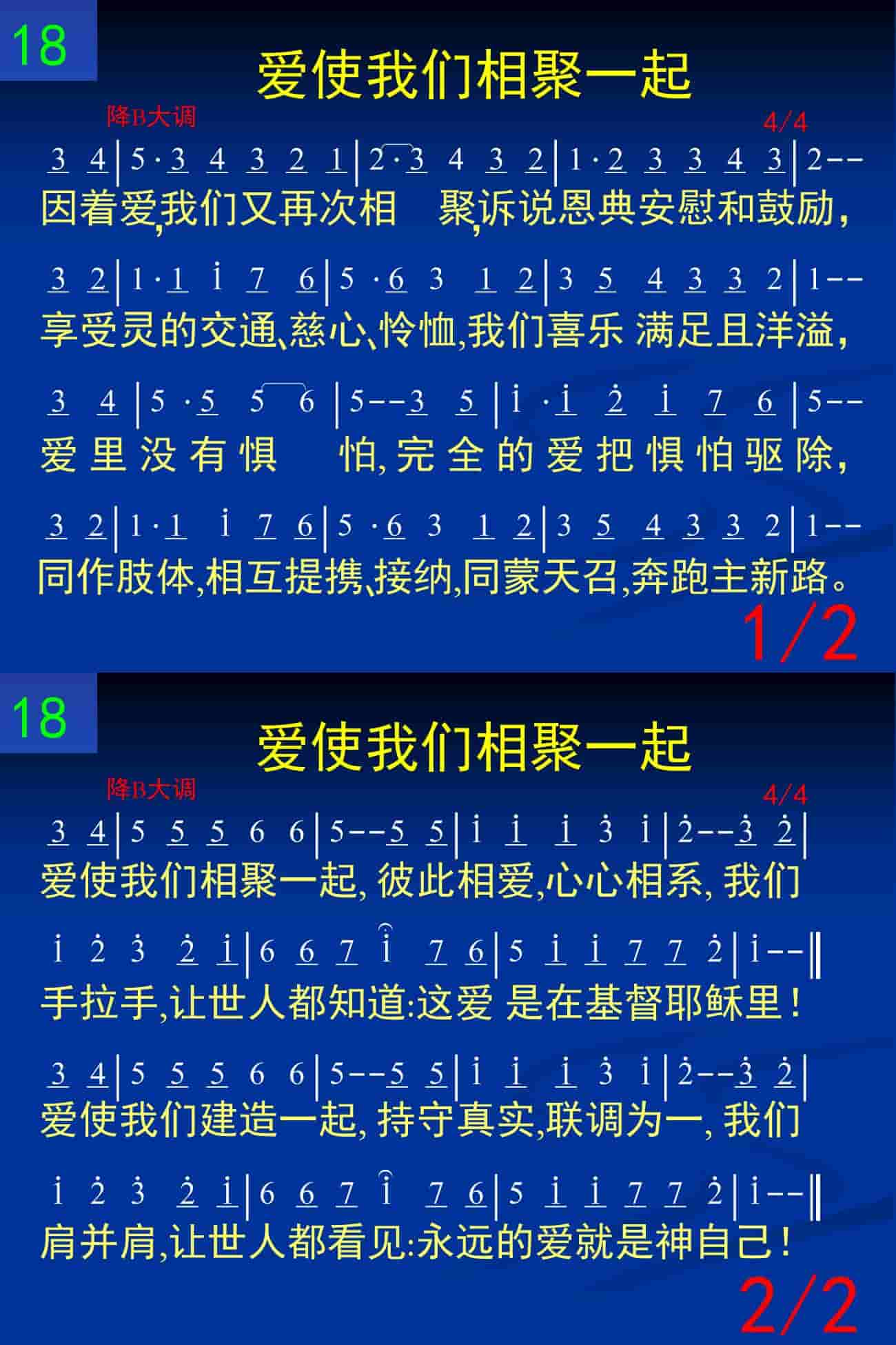 因着爱,我们又再次相聚,诉说恩典安慰和鼓励,享受灵的交通,慈心,怜悯,我们喜乐满足且洋溢,爱里没有惧怕,完全的爱把惧怕驱除,同作肢体,互相提携,接纳,同蒙天召,奔跑主新路,爱使我们相聚一起,彼此相爱,心心相系,我们手拉手,让世人都知道:这爱是在耶稣基督里!爱使我们建造一起,持守真实,联调为一,我们肩并肩,让世人都看见:永远的爱就是神自己!
