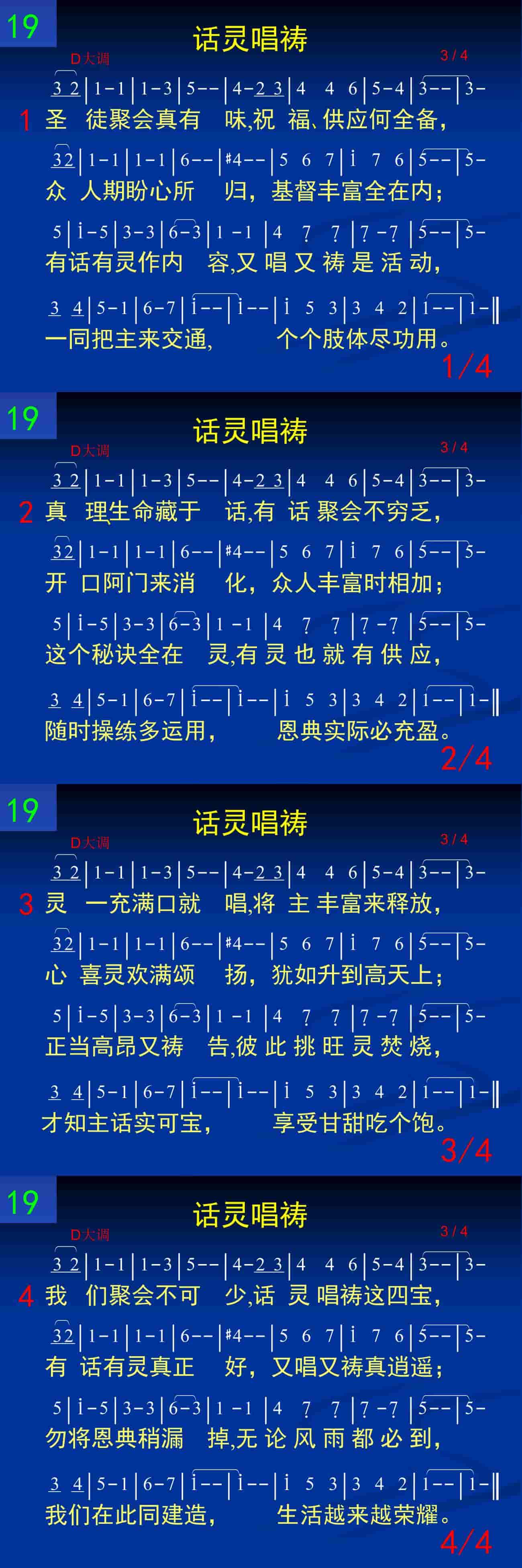 我们聚会不可少,话灵唱祷这四宝,有话有灵真正好,又唱又祷真逍遥;勿将恩典稍漏掉,无论风雨都必到,我们在此同建造,生活越来越荣耀。