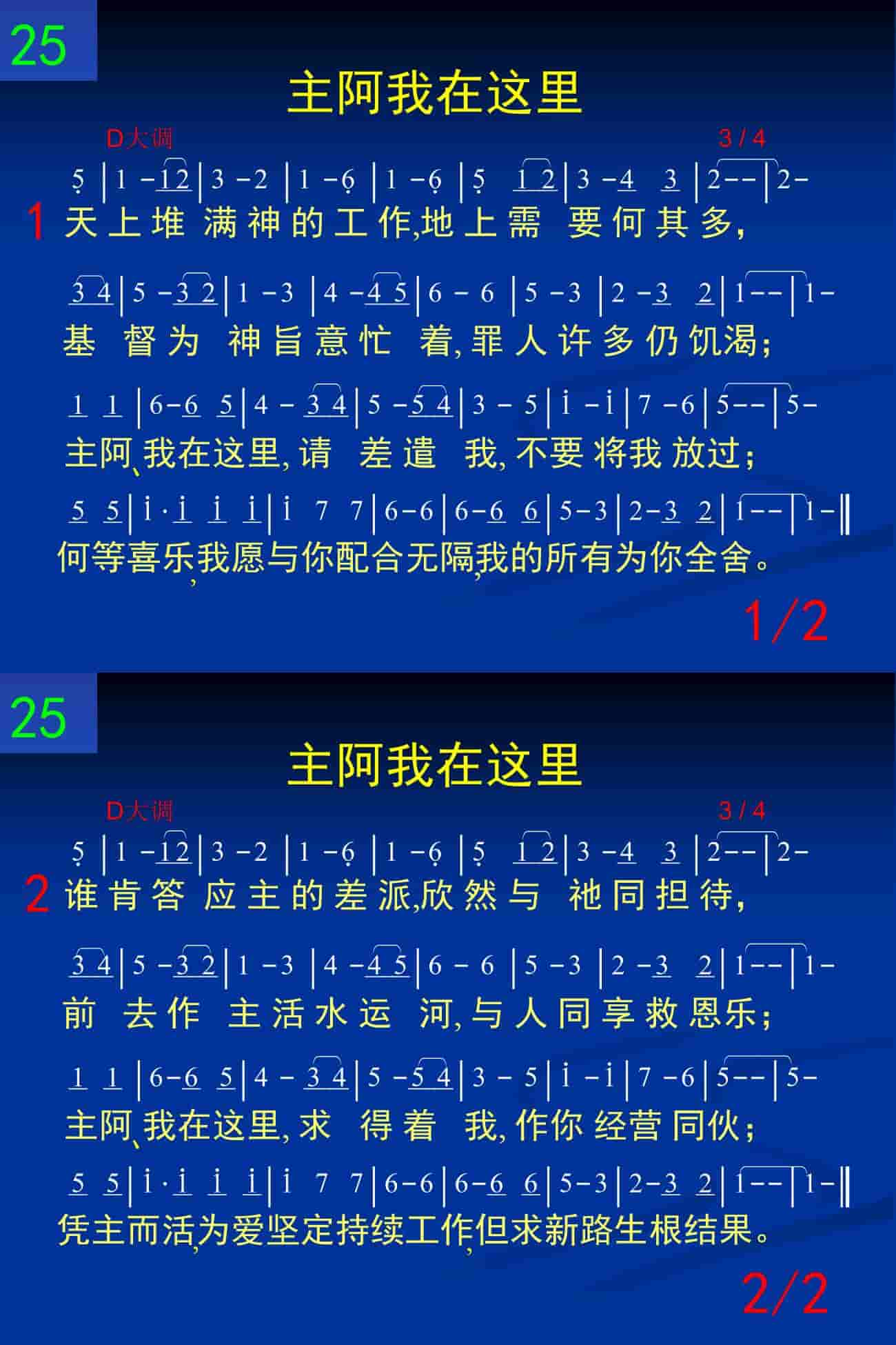 天上堆满神的工作,地上需要何其多,基督为神的旨意忙着,罪人许多仍饥渴;主啊!我在这里,请差遣我,不要将我放过放过;何等喜乐,我愿与你配合无隔,我的所有为你全舍。
