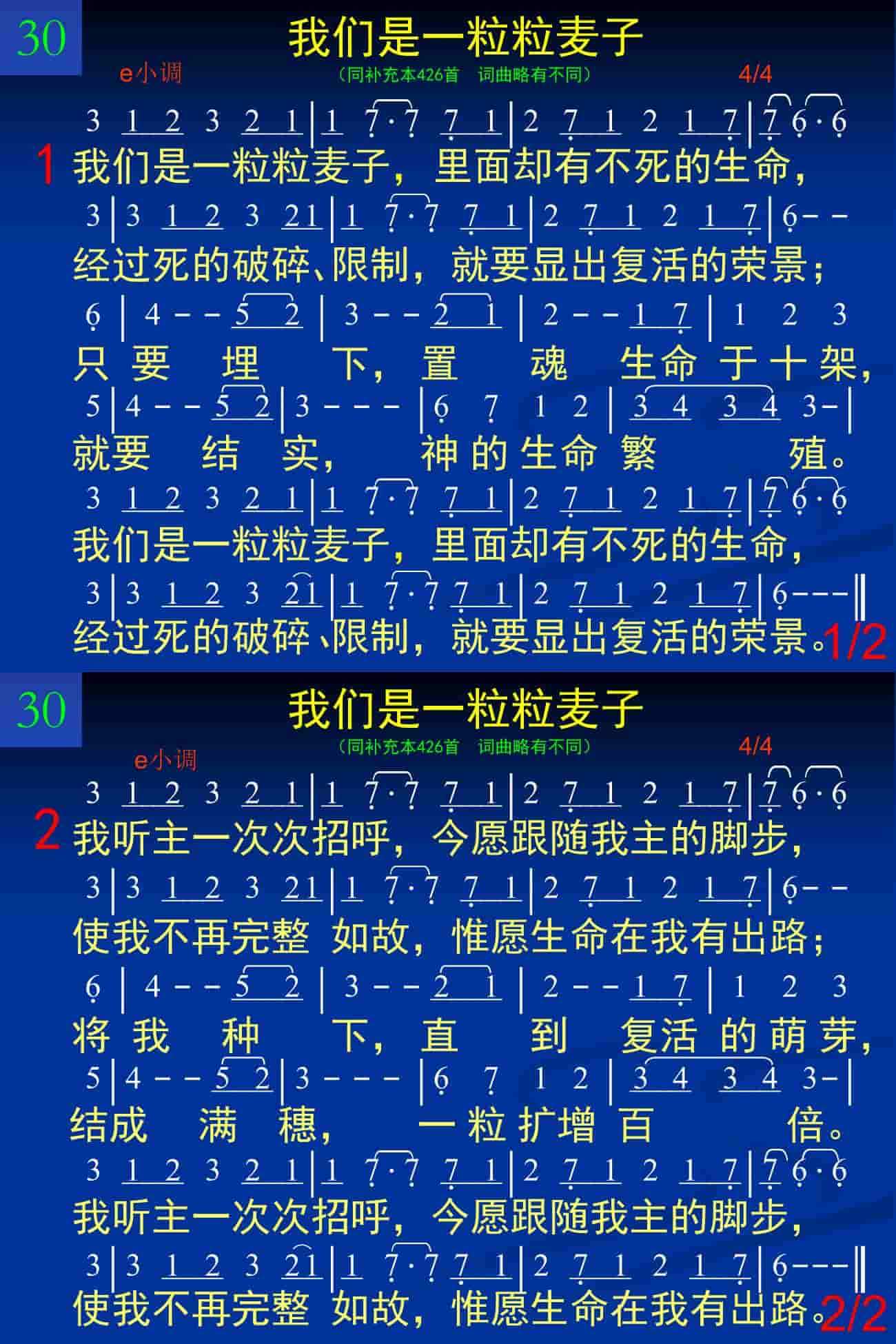 我们是一粒粒麦子,里面却有不死的生命,经过死的破碎,限制,就要显出复活的荣景;只要埋下,置魂生命于十架,就要结实,神的生命繁殖。我们是一粒粒麦子,里面却有不死的生命,经过死的破碎,限制,就要显出复活的荣景;