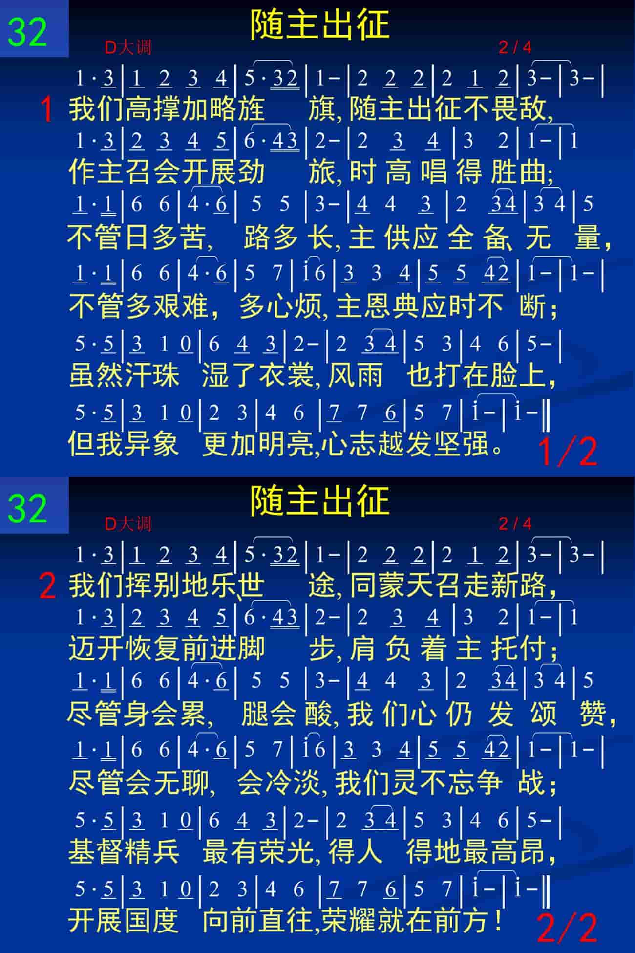 我们挥别地乐、世途,同蒙天召走新路,迈开恢复前进脚步,肩负着主托付;尽管身会累,腿会酸,我们心仍发颂赞,尽管会无聊,会冷谈,我们灵不忘争战;基督精兵最有荣光,得人得地最高昂,开展国度向前直往,荣耀就在前方!