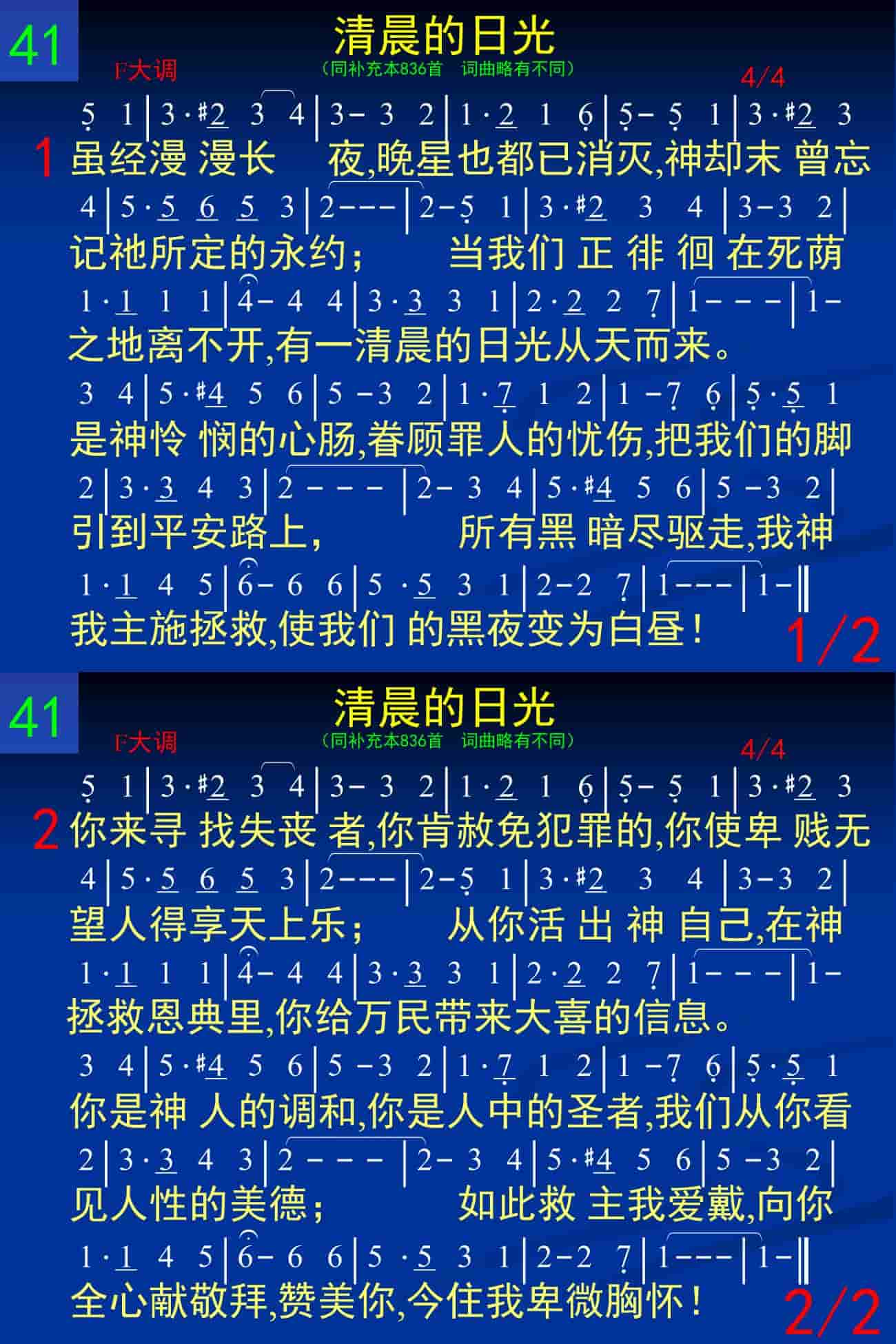 虽经漫漫长夜,晚星也都已消灭,神却未曾忘记祂所定的永约;当我们正徘徊在死阴之地离不开,有一清晨的日光从天而来。是神怜悯的心肠,眷顾罪人的忧伤,把我们的脚引到平安路上,所有黑暗尽驱走,我神我主施拯救,使我们的黑夜变为白昼!