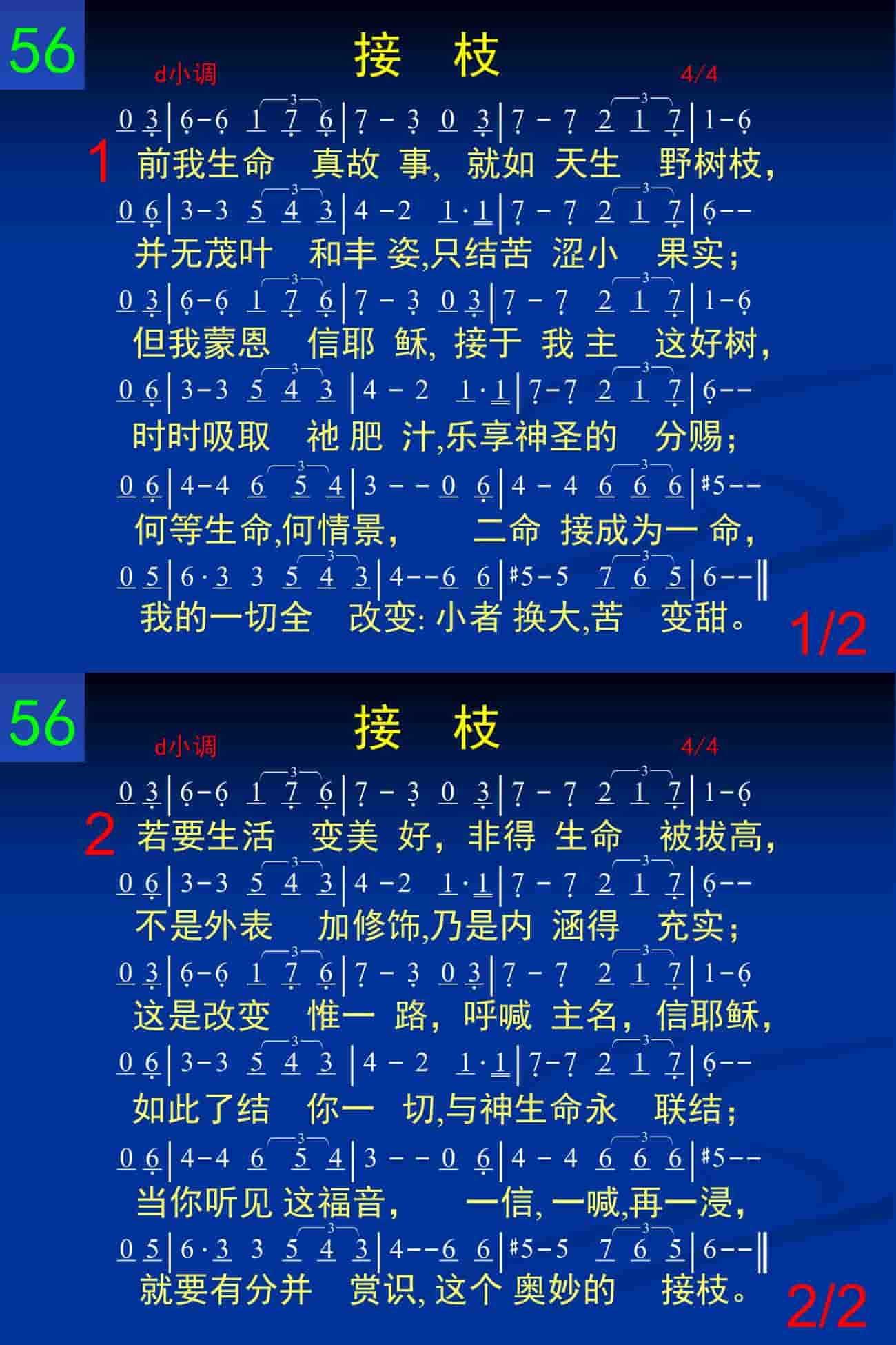 前我生命真故事,如天生野树枝,并无茂叶和丰姿,只结苦涩小果实;但我蒙恩信耶稣,接于我主这好树,时时吸取祂肥汁,乐享神圣的分赐;何等生命,何情景,二命接成为一命,我的一切全改变:小者换大,苦变甜。