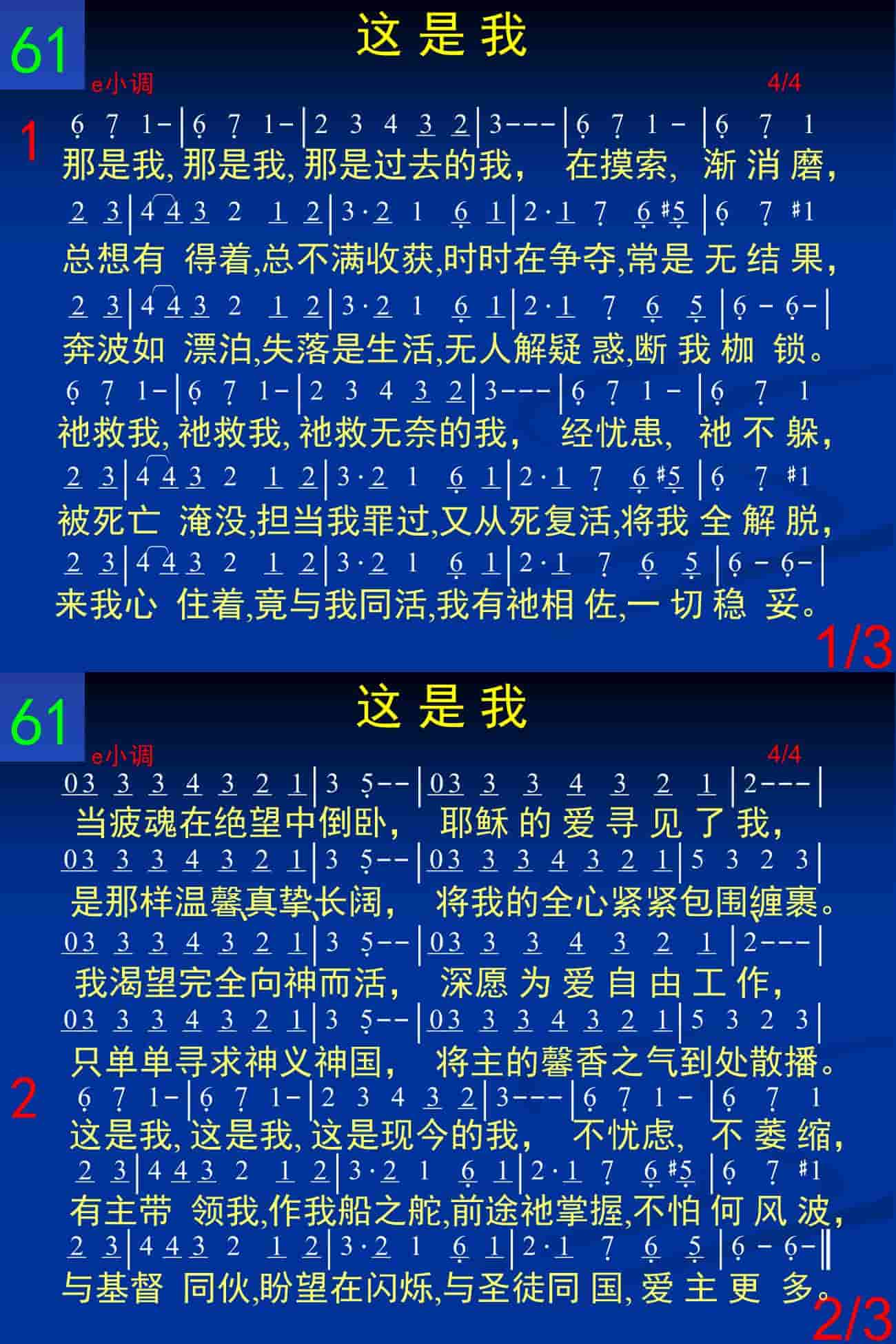 这是我,这是我,这是现今的我,不忧虑,不萎缩,有主带领我,作我船之舵,前途祂掌握,不怕何风波,与基督同伙,盼望在闪烁,与圣徒同国,爱主更多。
