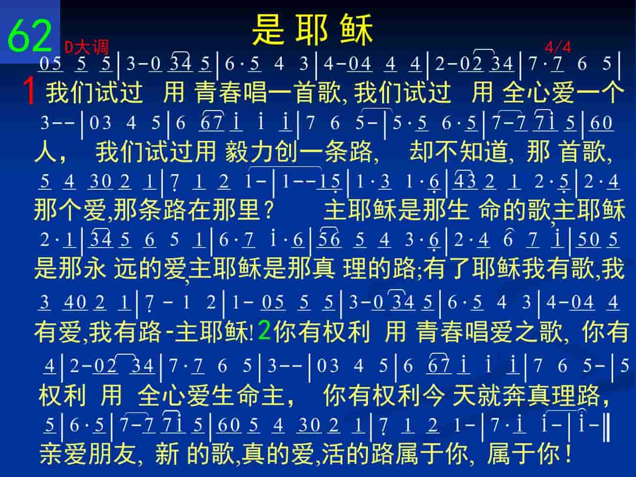 我们试过用青春唱一首歌,我们试过用全心爱一个人,我们试过用毅力创一条路,却不知道,那首歌,那个爱,那条路在哪里?主耶稣是那生命的歌,主耶稣是那永远的爱,主耶稣是那真理的路;有了耶稣我有歌,我有爱,我有路—主耶稣!