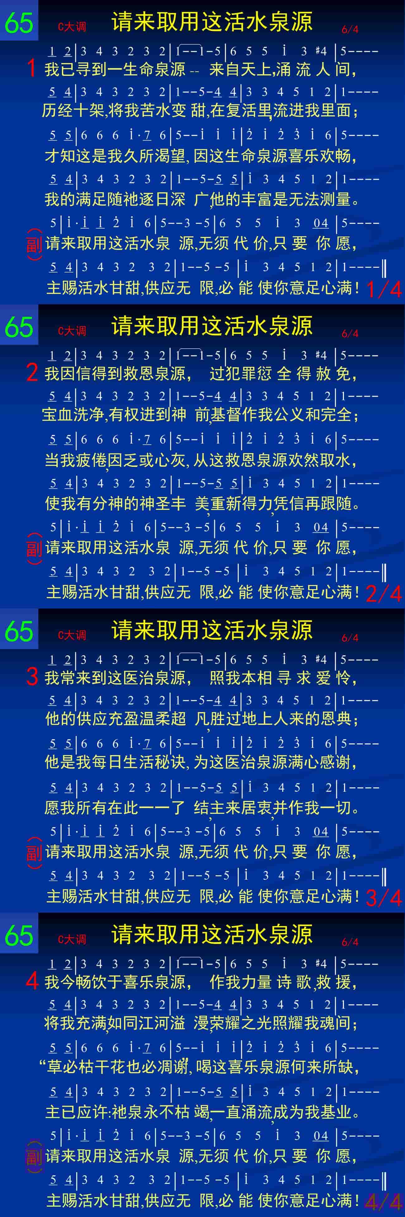 请来取用这活水泉源,无须代价,只要你愿,主赐活水甘甜,供应无限,必能使你意足心满!