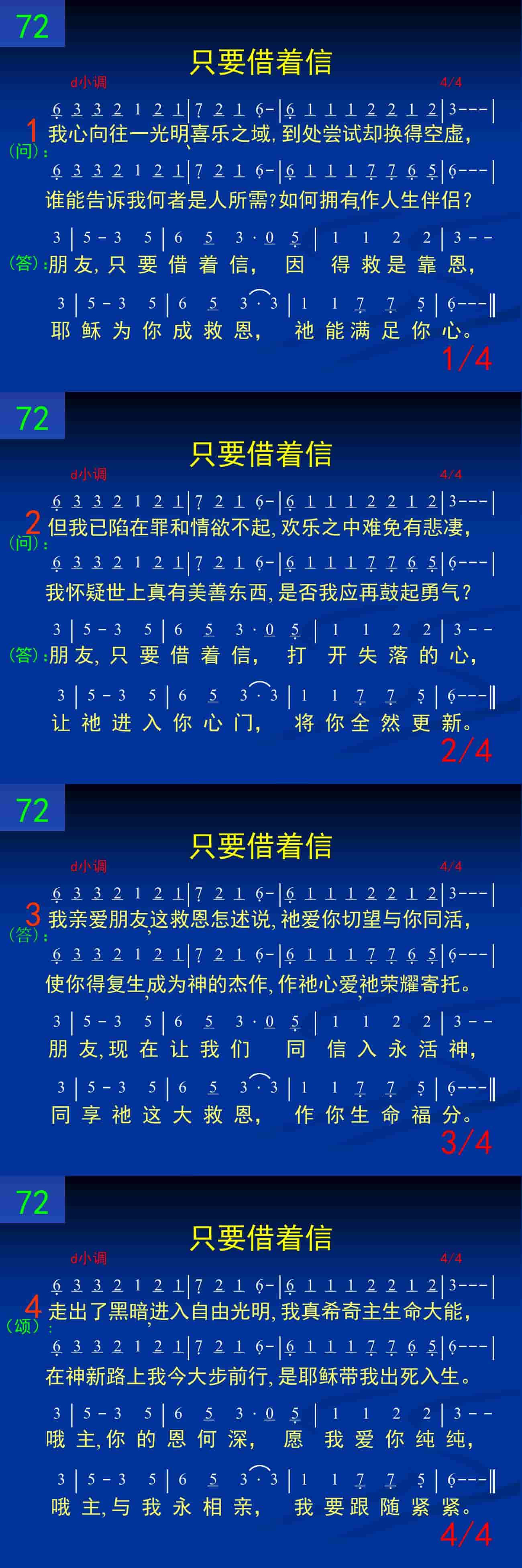 (问):我心向往一光明、喜乐之域,到处尝试却换得空虚,谁能告诉我何者是人所需?如何拥有,作人生伴侣?(答):朋友,只要借着信,因得救是靠恩,耶稣为你成救恩,祂能满足你心。
